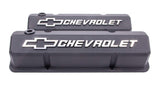 Valve Cover - Slant-Edge - Tall - Baffled - Breather Hole - Raised Chevrolet Bowtie Logo - Aluminum - Black Crinkle Powder Coat - Small Block Chevy - Pair